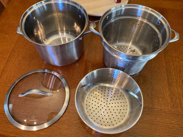 Bring stunning, contemporary design to your kitchen with Calphalon Contemporary Stainless Steel cookware. Crafted from two layers of stainless steel with a full aluminum core, the 8 Qt. Multi-Pot can be used three different ways. Use it with the pasta insert to cook and then drain pasta or potatoes; use the steaming basket for vegetables or fish; or use the generously-sized stock pot alone when preparing soups, stocks or chili. Stockpot has two looped handles that are easy to grasp, even with oven mitts. Includes tempered glass cover.